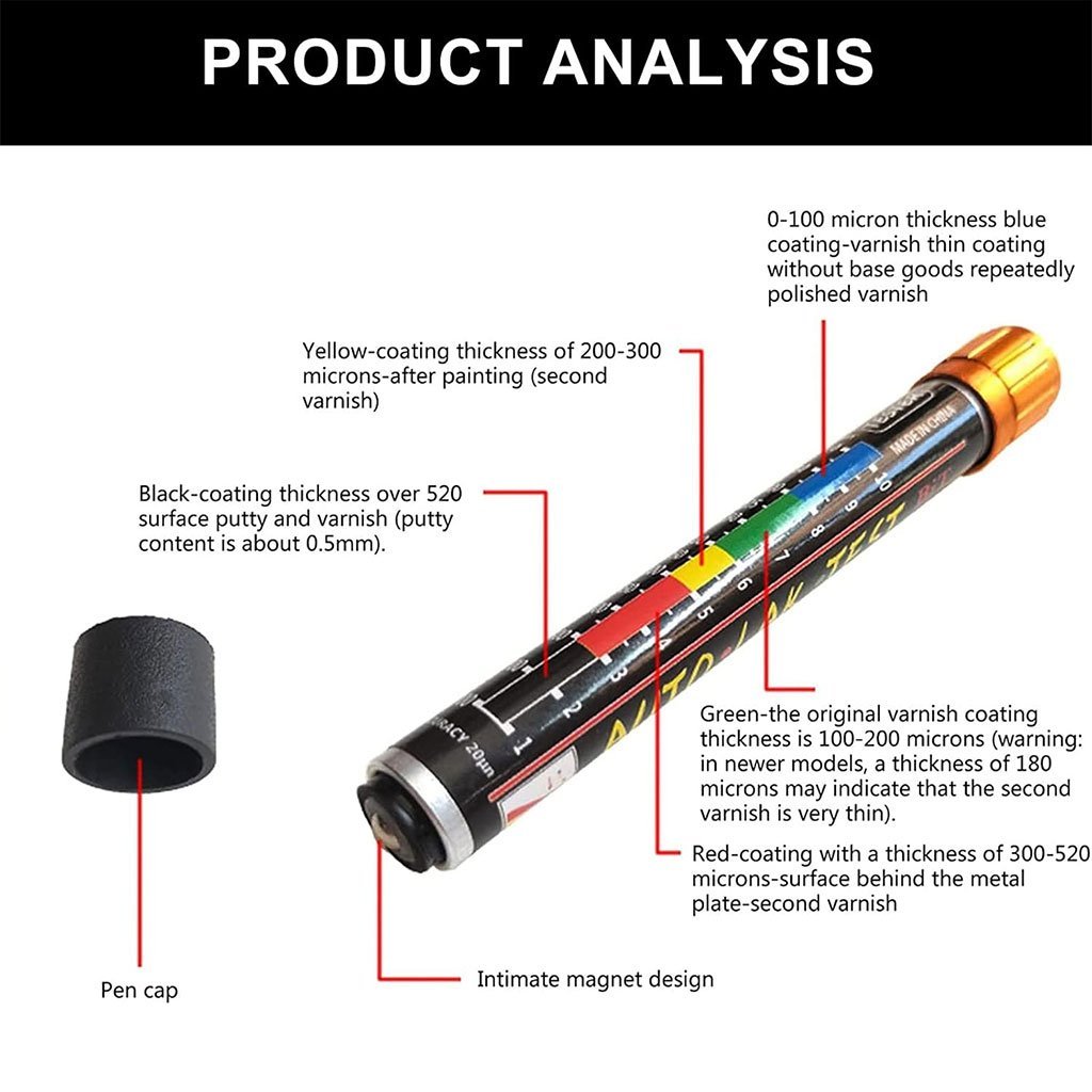 Caractéristiques : 1. Échelle de couleurs en microns. 2. Embout magnétique permettant une fixation sur toute surface courbe ou difficile d’accès. 3. Mesure de l’épaisseur du vernis et du mastic par simple contact de l’embout du testeur avec l’aimant de la surface à tester (surface propre et exempte de poussière). 4. Mesure l’épaisseur des vernis avec une précision de 20 microns. 5. Vérification rapide et précise de l’état de la peinture du véhicule. 6. Permet de détecter l’épaisseur des couches de peinture invisibles à l’œil nu sur les véhicules en tôle d’acier et en acier galvanisé. 7. Fonctionne sans piles. 8. Finition soignée. 9. Résistant à l’eau. 10. Haute précision et fiabilité. 11. Utilisation simple et pratique. Signification des différentes couleurs : Bleu : revêtement d’une épaisseur de 0 à 100 microns – fine couche de vernis (vernis sans sous-couche ou poli à plusieurs reprises). Vert : revêtement d’une épaisseur de 100 à 200 microns pour les vernis d’origine. Attention : sur les modèles de voitures récents, une épaisseur de 180 microns peut indiquer une fine couche de vernis secondaire. Jaune : revêtement d’une épaisseur de 200 à 300 microns – après réparations de peinture (« vernis secondaire »). Rouge : revêtement d’une épaisseur de 300 à 520 microns – surface après réparations de tôlerie et application d’un vernis secondaire. Noir : revêtement d’une épaisseur supérieure à 520 microns – surface mastiquée et vernie (épaisseur de mastic : environ 0,5 mm). Spécifications : État : 100 % neuf. Nom du produit : Testeur d’épaisseur de peinture. Matériau : ABS. Dimensions : 13,7 × 1,26 cm (environ). Haute précision et fiabilité. Utilisation facile. Contenu de l’emballage : 1 testeur d’épaisseur de peinture.