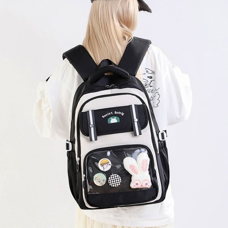 Ajoutez une touche de fantaisie au quotidien scolaire de votre enfant avec ce sac à dos au design kawaii signé BoShiKai . Pratique, original et personnalisable, il plaira autant aux petites qu’aux adolescentes ! Design Kawaii Personnalisable – Une grande poche transparente pour y glisser peluches, autocollants, badges ou petits objets décoratifs. Confort Quotidien – Bretelles larges et ajustables, dossier matelassé pour un port confortable. Poches Multiples – Plusieurs compartiments pour cahiers, trousses, tablette, gourde, etc. Motif Lapin & Logo Mignon – Un style tendance avec son petit lapin blanc et son look coréen. Idéal pour École ou Sorties – Léger, résistant et stylé. Caractéristiques : Dimensions : 45 x 35 x 25 cm Couleur : Noir et crème Poche frontale transparente avec badges et peluche inclus Public : Enfants (primaire, collège ou fans de kawaii) Fermetures éclairs solides, tissu imperméable et durable