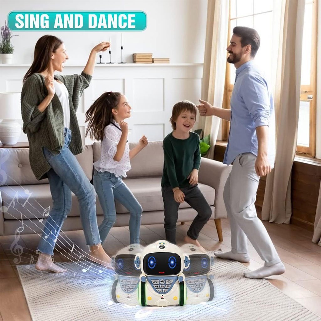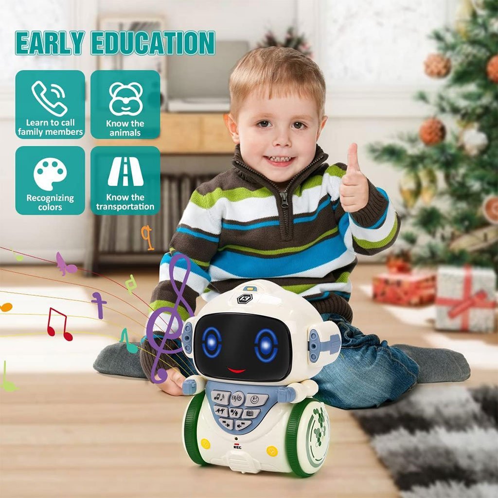 【Robot intelligent】Bonjour, je m’appelle Bill ! J’ai de nombreuses fonctions : je comprends vos commandes vocales et je peux effectuer certaines actions. Je peux avancer, reculer, tourner à gauche, tourner à droite et faire un tour sur moi-même à 360 degrés. Je peux aussi chanter, danser et parler avec vos enfants. 【Commande vocale】Ce robot est si intelligent qu’il comprend vos commandes vocales et y répond. En mode de commande vocale, il peut recevoir 14 commandes vocales spécifiques telles que « Chante une chanson. Raconte une histoire. D’où viens-tu ?… ». Le robot répondra par une voix robotique et effectuera des actions. 【Répétition avec une voix adorable】Ce petit personnage aux grands yeux lumineux peut non seulement parler le langage robotique, mais aussi répéter tout ce que dit l’enfant avec une voix adorable, encourageant ainsi sa prononciation et développant ses compétences linguistiques. Le volume est réglable. 【Raconte des histoires et joue des blagues】Appuyez sur le bouton BLAGUE pour écouter une blague anglaise aléatoire (5 blagues au total), appuyez sur le bouton HISTOIRES pour écouter une histoire anglaise (4 histoires au total). Grâce au mode apprentissage, les enfants peuvent apprendre à s’adresser aux membres de leur famille, à reconnaître les animaux, les couleurs et les différents moyens de transport. Dimensions du produit 13,46 x 10,92 x 16 cm ; 440 g