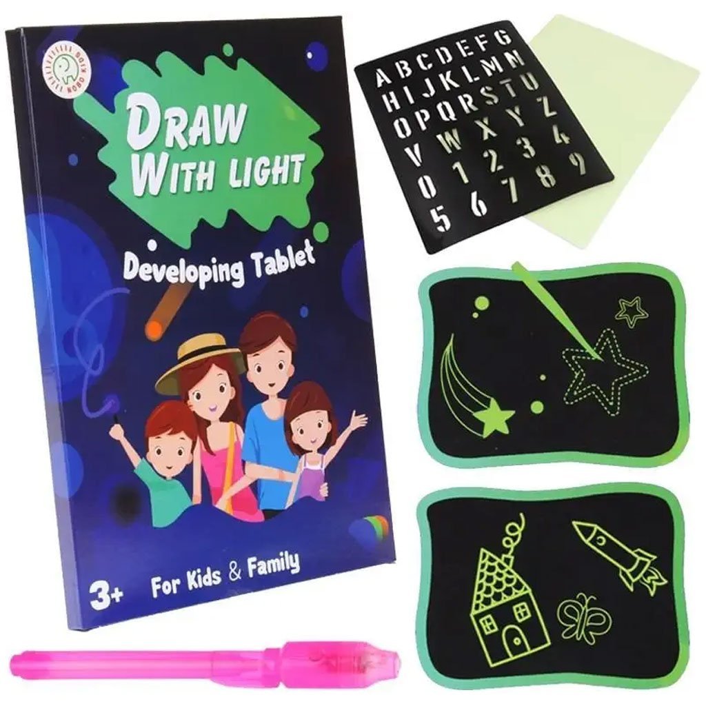L’ensemble comprend : – un tableau luminescent – un marqueur incolore avec LED dans le capuchon – un modèle avec des chiffres et des lettres – des instructions Comment dessiner ? Un kit pour dessiner dans le noir. Il y a une diode LED sur le capuchon du marqueur, qui peut être activée en appuyant sur le bouton situé sur le côté du capuchon. Pour commencer à dessiner, dirigez la lumière vers le tableau. Placez le marqueur perpendiculairement au tableau et ajustez la distance appropriée entre le marqueur et la surface luminescente : plus elle est proche, plus la ligne est nette et lumineuse. À mesure que la lumière diminue, la ligne semble se disperser et se brouiller. Positionnez le marqueur en biais par rapport à la tablette, cliquez et tracez une ligne pour créer un effet de bord flou. Les dessins ne peuvent pas être effacés, ils disparaissent progressivement au bout de 30 à 40 minutes, mais chaque ligne nouvellement tracée sera plus lumineuse que la précédente. De plus, le marqueur possède une encre invisible pour une écriture secrète qui apparaît sous la lumière d’une lampe de poche LED. La surface luminescente ne peut pas être peinte ou écrite avec de l’encre, car elle ne peut pas être retirée du tableau. Lors du changement des piles, dévissez le haut du capuchon et tirez doucement sur la LED, retirez les anciennes piles et insérez les nouvelles. Informations importantes : >