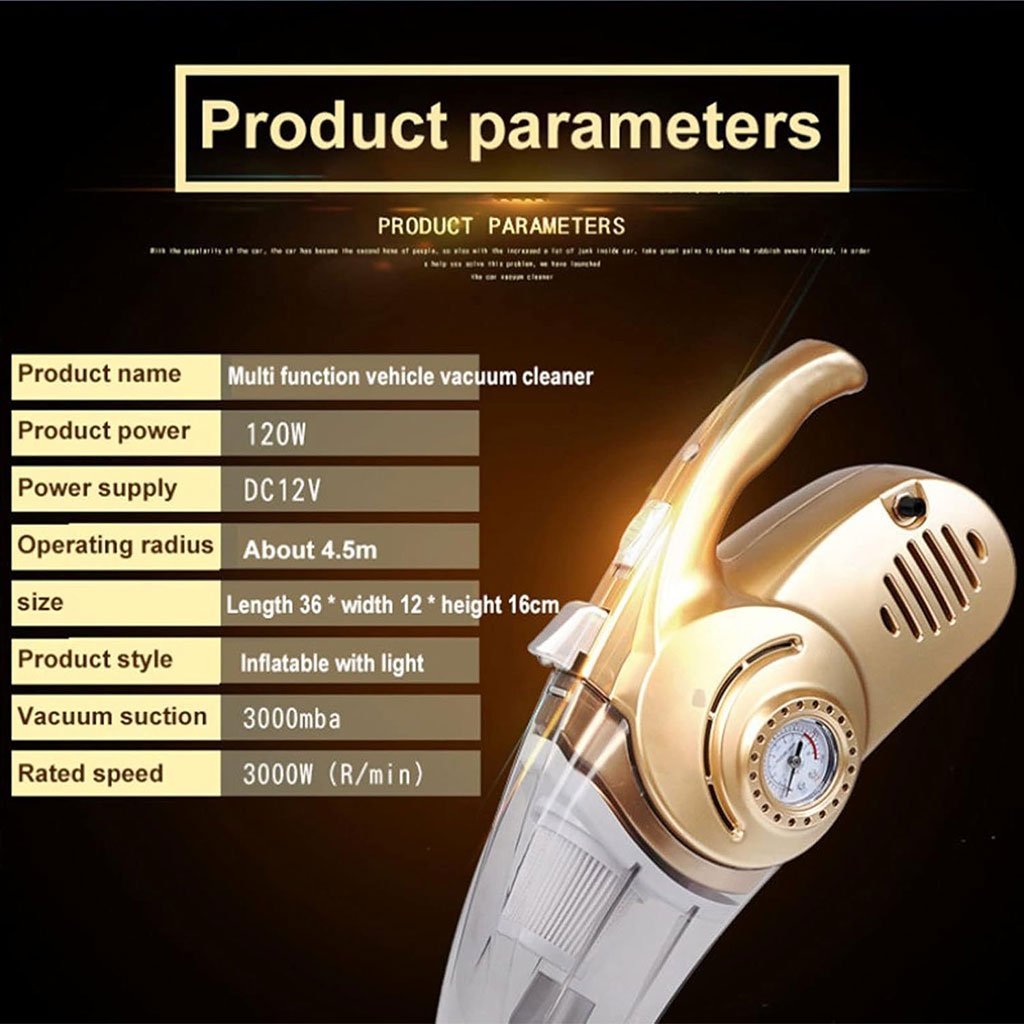 Polyvalence et forte aspiration : aspirateur de voiture 12 V 100 W, aspiration super puissante, supporte une utilisation sèche et humide, peut facilement ramasser la poussière, les miettes, les poils d’animaux, les liquides et bien plus encore. Équipé de 3 types d’accessoires différents pour bien nettoyer toutes les zones de votre maison ou de votre voiture. Design innovant : avec un gonfleur de pneu numérique intelligent, assurez-vous que la pression des pneus est précise et gonflez les pneus à tout moment et n’importe où en 5 minutes. Lumière LED intégrée : l’aspirateur à main dispose d’une lumière LED intégrée, une grande aide pour le nettoyage des endroits sombres et le nettoyage de nuit. Avec cela, vous pouvez nettoyer les endroits difficiles à atteindre sans problème. Fonctionnement plus silencieux : produit moins de 80 dB de son tout en conservant sa puissante capacité d’aspiration basée sur les principes d’amortissement mécanique, ce qui vous donne une expérience de nettoyage confortable, sans déranger vos enfants et effrayer vos animaux de compagnie.