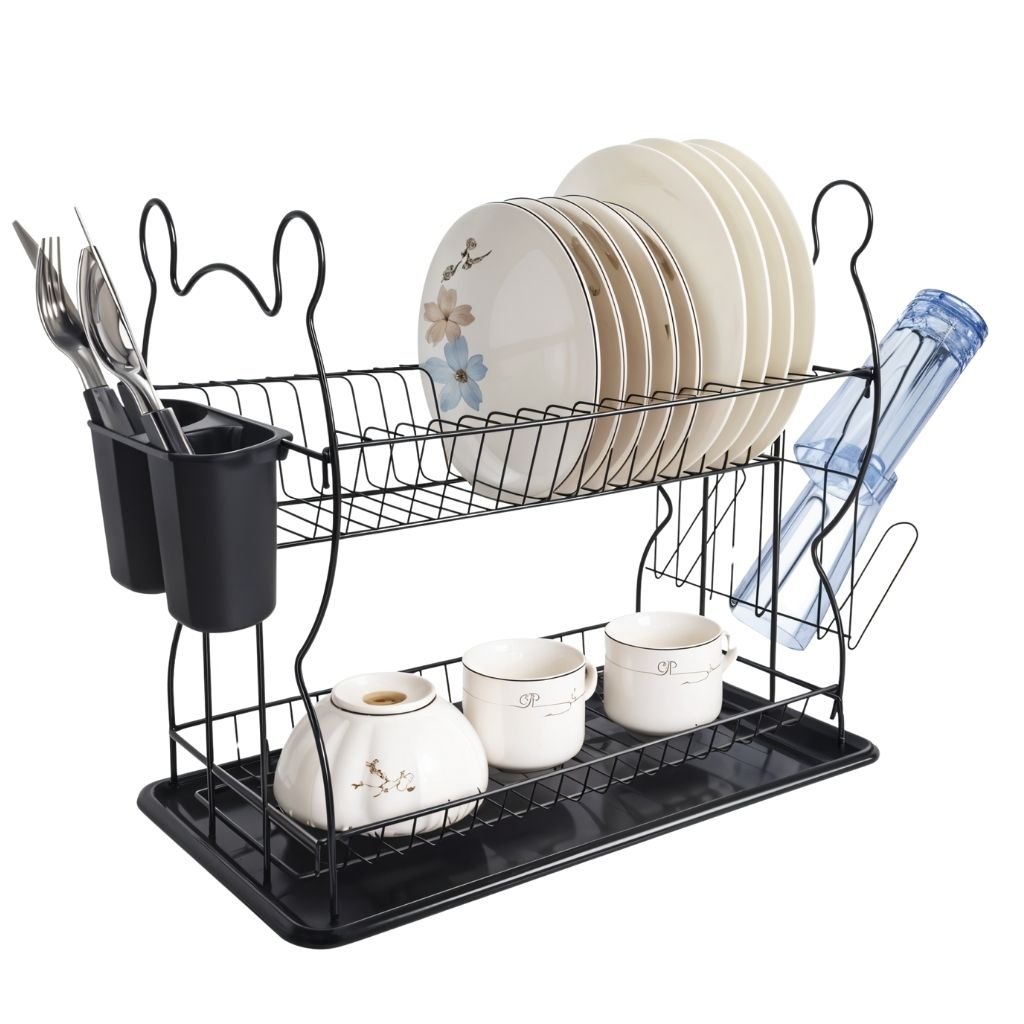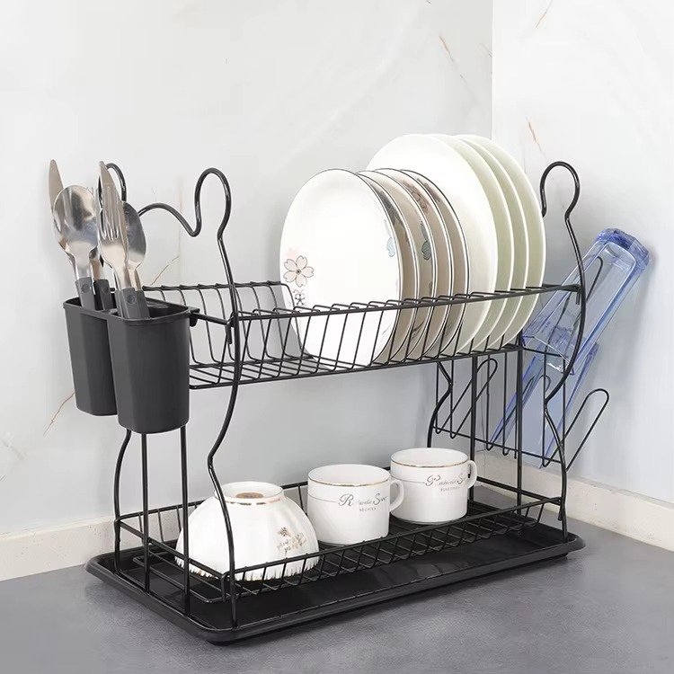 تصميم على مستويين: رف يجمع بين مستويين لتجفيف وتنظيم كمية كبيرة من الأطباق والأكواب وأدوات المطبخ، مما يوفر المساحة.